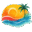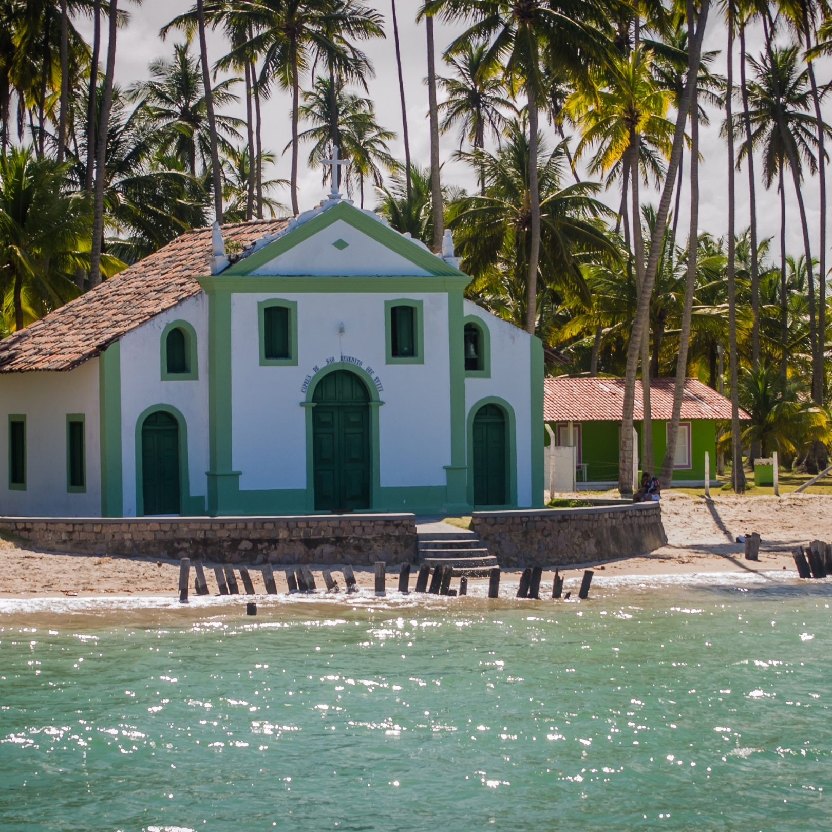 Um cenário paradisíaco com coqueiros à beira-mar, águas calmas e a icônica igrejinha de São Benedito.